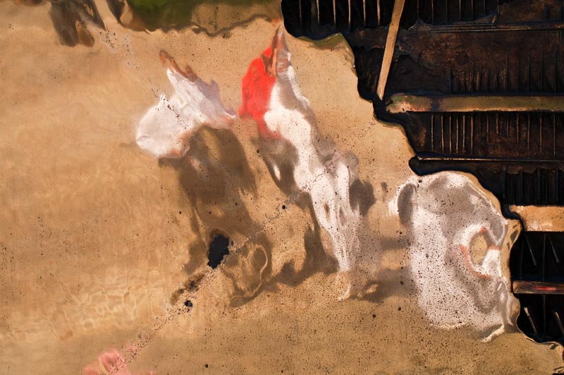 Sono le urla cromatiche di Francis Bacon, le devastanti esplosioni di carne e materia che squadernano davanti ai nostri occhi pigri tutto il loro ( nostro ) allarme esistenziale. L’effetto è moltiplicato dalla porzione della fotografia in cui la superficie riflettente lascia intravedere una struttura diversa e sottostante.