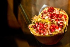 Una panchina nel sole di un giardino. Una melagrana spaccata periclitante sul bordo di un tavolo.